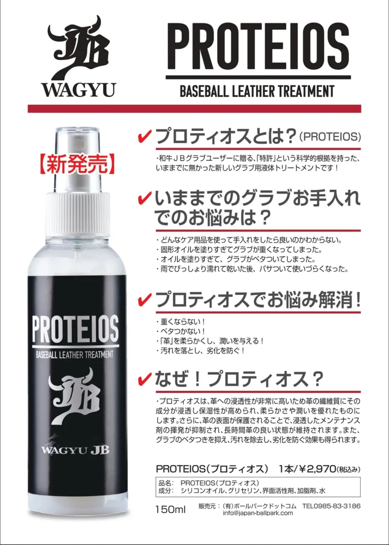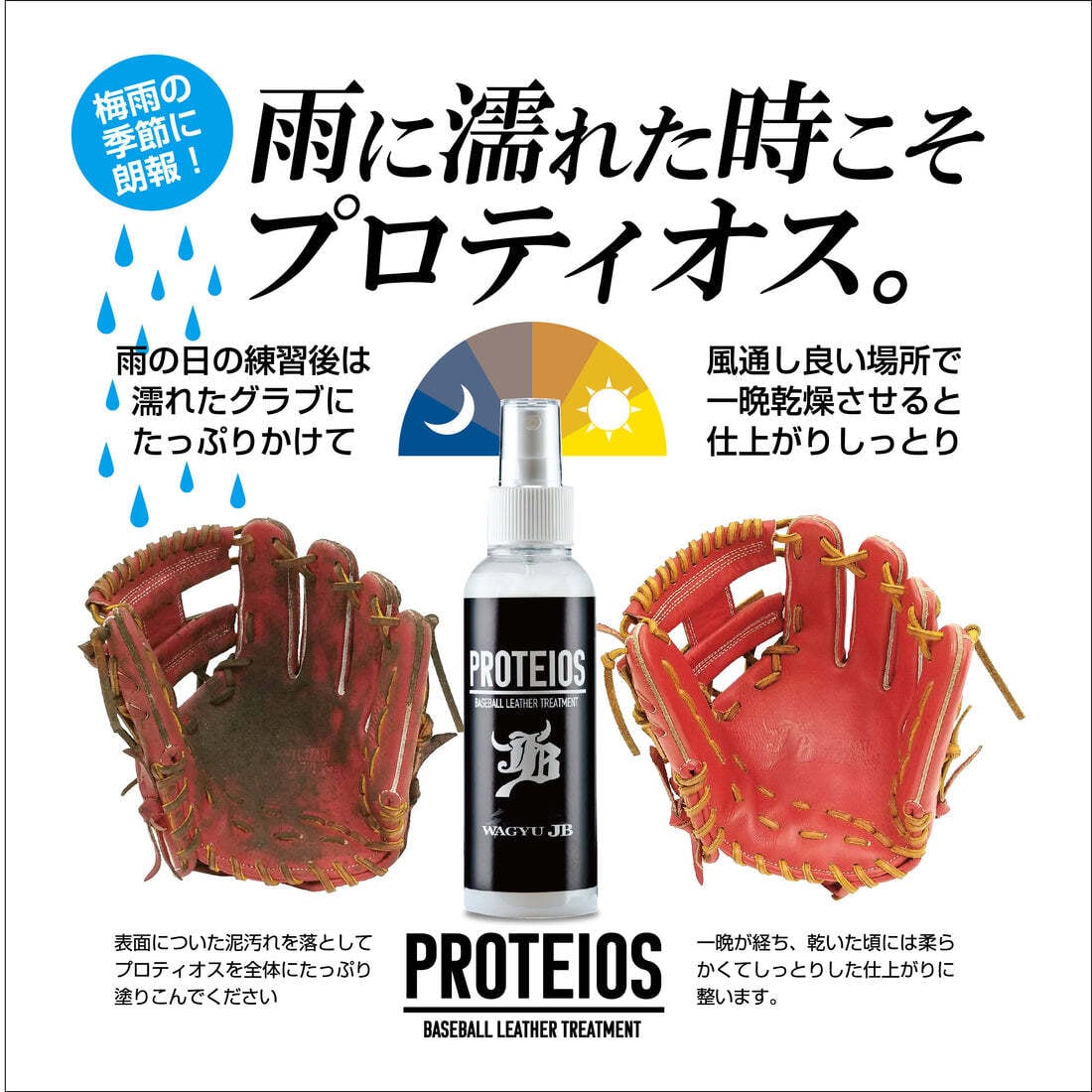 PROTEIOSとは和牛JBグラブの販売開始から3年。グラブ素材のこだわりを持って長い年月をかけて研究・開発をしたトリートメント剤のことです。